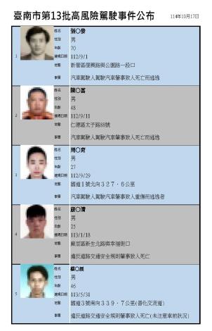 臺南市公布第13批高風險駕駛事件